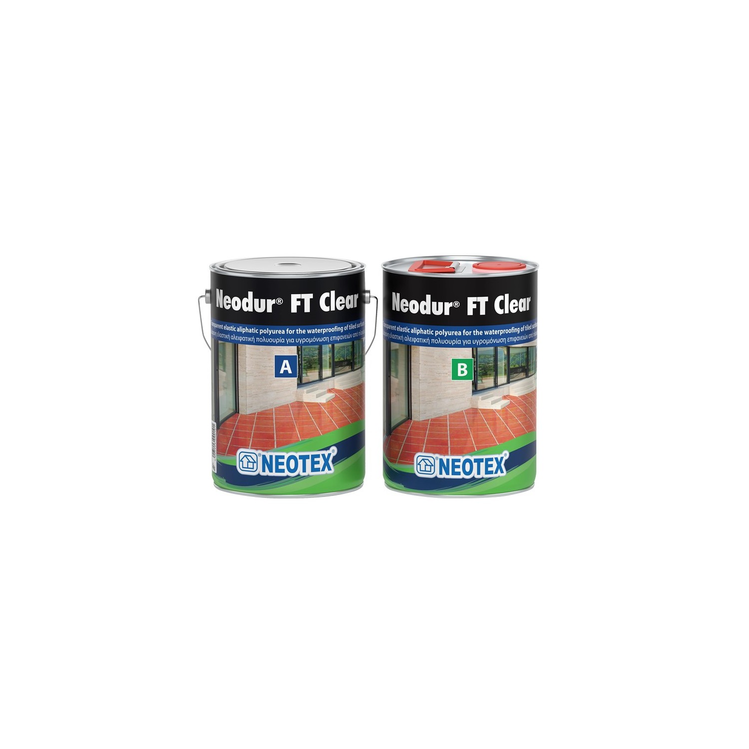 נאודור אף.טי קליר מסופק בסטים של (A+B) פחי מתכת של 2, 8, 20 ק"ג.